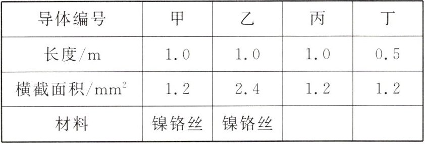 (2)甲、丙两个导体的横截面积与长度相同,要探究导体电阻与导体材料种类的关系,应控制甲、丙的材料不同,因此丙必须选用锰铜丝;丁与甲和丙的横截面积相同,长度不同,因此要探究导体电阻与导体长度的关系,丁可选择与甲或丙相同的材料,即选用镍铬丝或锰铜丝.