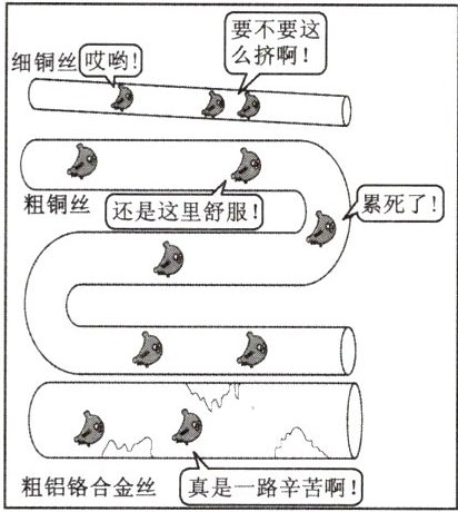 长度 横截面积 解析:根据卡通人物的对话可知,导体越细时,电流通过时越挤,表明导体横截面积越小时,电阻越大;导体越长,电流通过时越累,表明导体越长,电阻越大;铝铬合金丝内崎岖不平,电流通过时辛苦,表明导体的材料影响电阻大小.故导体的电阻大小与导体的材料、长度和横截面积有关.