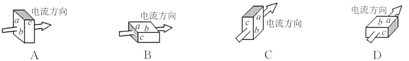 22. 欧姆不仅发现了欧姆定律,还研究了决定电阻大小的因素.一个长方体金属导体的材料分布均匀,长、宽、高分别为a、b、c,且$a>b>c$.电流沿下图中箭头所指方向流过该金属导体时,电阻最小的是 ()