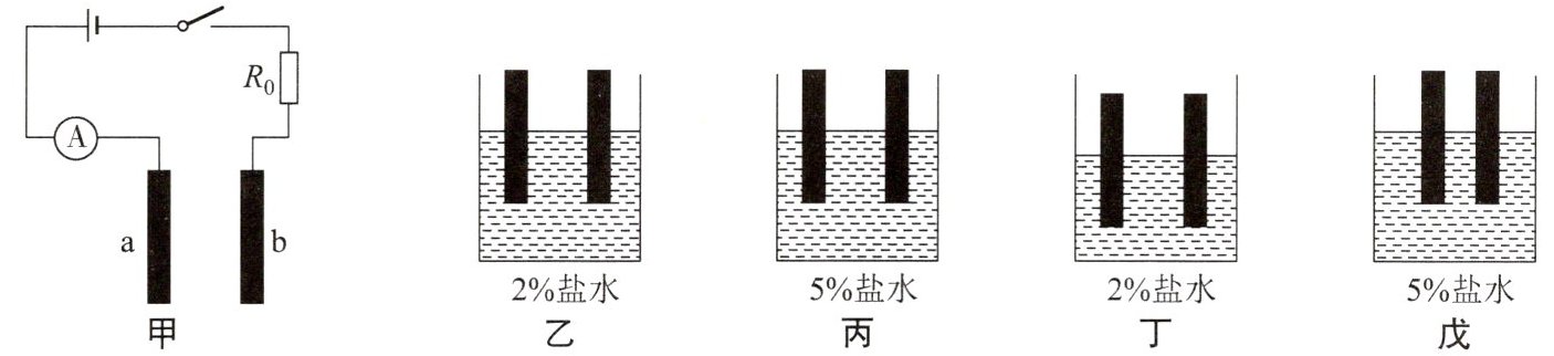 (3)题图乙、丙中溶液的质量和金属片间的距离相等,食盐水溶液的浓度不同,可探究食盐水溶液的导电性能与溶液的浓度是否有关;为了探究食盐水溶液的导电性能与溶液的质量的关系,需要保持溶液的浓度和金属片间的距离不变,改变溶液的质量,故应将金属片a、b分别插入题图乙、丁所示位置.