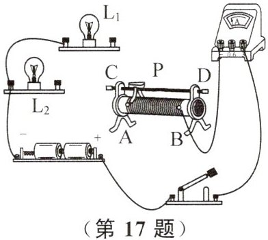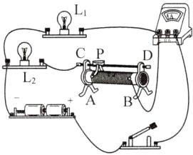 解析:灯泡L₁与L₂并联,滑动变阻器控制灯泡L₂的亮度,因此滑动变阻器与灯泡L₂串联,开关闭合前,滑动变阻器滑片应移至阻值最大处,滑片在最左端,故灯泡L₂与C或D接线柱相连,电流表测量总电流,应接在干路上。