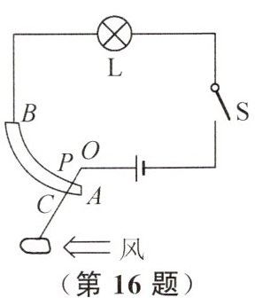 16. 一位同学设计了一个风力估测仪,如图所示,O是转动轴,OC是金属杆,下面连接着一块受风板. 无风时OC是竖直的,风越强,OC偏转的角度越大,AB是一段圆弧形电阻,P点是金属杆与圆弧形电阻相接触的点. 金属杆OC与圆弧形电阻AB组合在一起相当于一个____,测风力时,闭合开关S,风越大,电阻AB接入电路的电阻越____,电路中电流越____,小灯泡的亮度越亮,因此利用此装置可以粗略地知道风力大小.