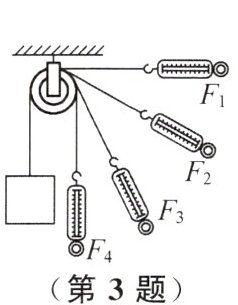 3. (2024·内江)如图所示,一根绳子绕过定滑轮,一端拴在物体上,另一端拴在弹簧测力计上,沿四个不同方向匀速拉起物体,弹簧测力计的示数分别为$F_{1}$、$F_{2}$、$F_{3}$、$F_{4}$,则它们的大小关系为()