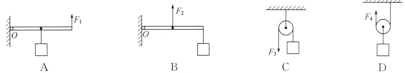 B 解析:若不计摩擦且忽略机械自重和绳重,则$F_{1}=\frac{G}{2},F_{2}=2G,F_{3}=G,F_{4}=\frac{G}{2}$,即$F_{2}$最大.