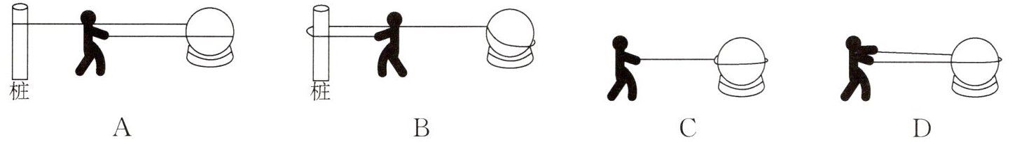 A 解析:球形石墩受到地面的滑动摩擦力$f_{摩}$是一定的,不考虑绳重和绳与石墩之间的摩擦力时,A选项中相当于使用了动滑轮,人对绳的拉力$F_{A}=\frac{1}{2}f_{摩}$;B选项中相当于使用了定滑轮,人对绳的拉力$F_{B}=f_{摩}$,C、D选项中人对绳的拉力等于石墩受到地面的摩擦力$f_{摩}$,即$F_{C}=F_{D}=f_{摩}$.A符合题意.