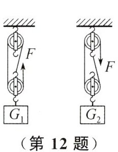12. 如图所示,每个滑轮的重力相等,不计绳重和摩擦,$G_{1}= 60N,$$G_{2}= 38N,$两个物体在大小相等的拉力F的作用下静止。则每个动滑轮的重力为()