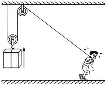 14. 如图所示,一人在地面上利用滑轮组和粗绳使质量为20kg的物体匀速上升了50cm,已知动滑轮的质量为2kg,g取10N/kg,人的拉力大小用F表示,人拉着绳的一端沿绳的方向斜向下运动的距离为s,则下列关系式中最符合实际的是()