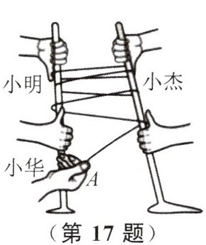 17. 小明和小杰握住两根较光滑的木棍,小华将绳子的一端系在其中一根木棍上,然后按如图所示的方式依次将绳子绕过两根木棍,小明和小杰相距一定的距离握紧木棍站稳后,小华在图中A处拉绳子的另一端,用很小的力便能拉动他们。