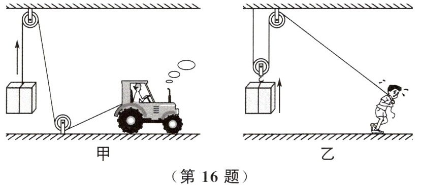 16. 如图甲、乙所示,分别用两种形式的滑轮组把重为400N的物体匀速向上提起。已知每个滑轮重20N,忽略绳子的重力以及摩擦,图甲中车对绳子的拉力为____N,图乙中人对绳子的拉力为____N。