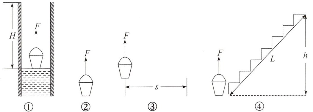①④ ① 解析:①由井下提起 $ H $ 高度, $ F $ 向上,水桶向上移动了 $ H $, $ F $ 对水桶做的功 $ W_{1} = FH $;②提着水桶不动, $ F $ 向上,水桶没有在 $ F $ 方向上移动距离, $ F $ 没有对水桶做功;③在水平面上移动一段距离 $ s $, $ F $ 向上,水桶没有在 $ F $ 方向上移动距离, $ F $ 没有对水桶做功;④爬上长为 $ L $、高为 $ h $ 的楼梯, $ F $ 向上,水桶向上移动的距离为 $ h $, $ F $ 对水桶做的功 $ W_{4} = Fh $.因为 $ H > h $,所以 $ W_{1} > W_{4} $.