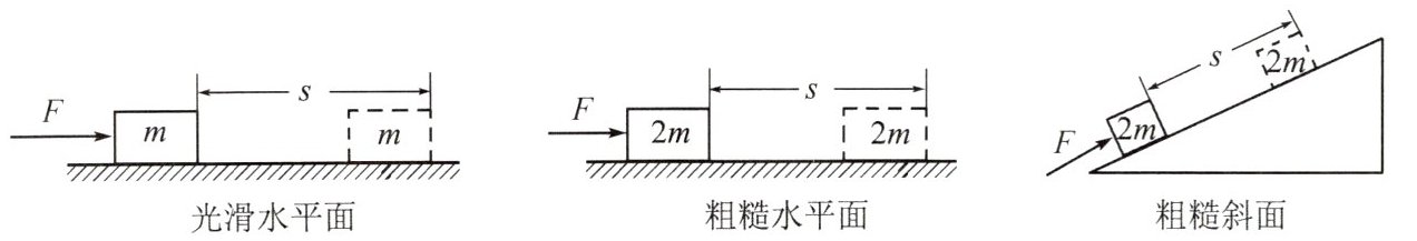 11. 一个人先后用同样大小的力 $ F $ 使不同的物体分别在光滑水平面、粗糙水平面和粗糙斜面上沿力的方向移动相同的距离 $ s $(如图所示),该力在这三个过程中所做的功分别为 $ W_{1} $、$ W_{2} $、$ W_{3} $,它们之间的大小关系是 ()