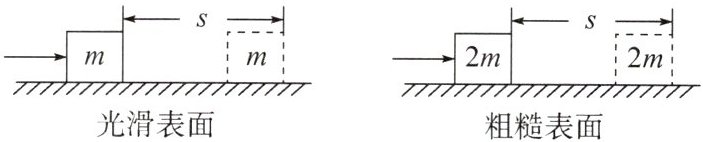 17. (2024·连云港)如图所示,同一个人先后两次用同样的时间、同样大小的力,将不同质量的物体在不同的表面上分别移动相同的距离.该力在此过程中所做的功大小分别为$W_{1}$、$W_{2}$,功率的大小分别为$P_{1}$、$P_{2}$,则它们之间的大小关系是 ()