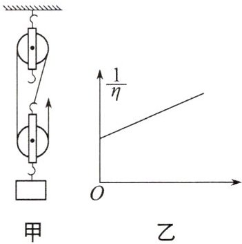 11. (双选)“在测量图甲所示滑轮组机械效率$η$”的实验中,通过改变物重$G或动滑轮重G_{动}$进行多次实验,得到了如图乙所示的机械效率与物重或动滑轮重的关系图像,图乙中纵轴表示机械效率的倒数$\frac {1}{η}$.若不计绳重与摩擦,则横轴可能表示 ()