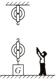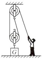 (2) $G_{总}=G+m_{轮}g=400N + 8kg \times 10N/kg=480N$,人对绳子的拉力 $F=\frac{1}{2}G_{总}=\frac{1}{2} \times 480N=240N$; $v_{物}=\frac{h}{t}=\frac{5m}{5s}=1m/s$,拉力的功率 $P=Fv=F \times 2v_{物}=240N \times 2 \times 1m/s=480W$