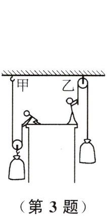 3. (2024·河南)如图所示,甲、乙两人用不同的装置在相同的时间内把地面上质量相等的物体匀速提升到同一平台,不计绳重及摩擦. 下列说法正确的是 ()