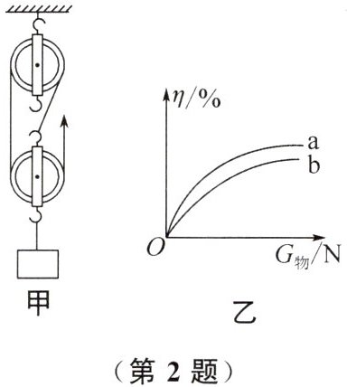 2. 为了研究机械效率与哪些因素有关,小明同学提出两个猜想,猜想一:机械效率与物重$G_{物}$有关;猜想二:机械效率与动滑轮重$G_{动}$有关. 为了验证猜想,小明先用如图甲所示的装置不断改变$G_{物}$,竖直向上匀速拉动弹簧测力计,计算并绘出$\eta与G_{物}$的关系图像,如图乙的图线a所示;然后换用另一个不同重量的动滑轮,不断改变$G_{物}$,计算并绘出$\eta与G_{物}$的关系图像,如图乙的图线b所示. 根据图像他 ()