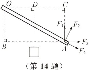 14. 如图所示,有一根杠杆可绕O点转动,在其中点挂一个重物,现在A点施加动力$F_{A}$.