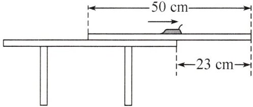 6. 小华发现一只虫子在长$50cm$、质量为$10g$的刻度尺上向右爬行.她将刻度尺右端伸出水平课桌边缘$23cm$,如图所示,当虫