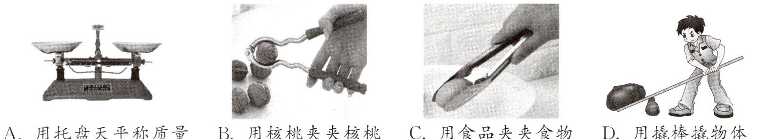 C 解析:用托盘天平称质量的过程中,动力臂等于阻力臂,是等臂杠杆,不能省距离,A不符合题意;用核桃夹夹核桃的过程中,动力臂大于阻力臂,是省力杠杆,费距离,B不符合题意;用食品夹夹食物的过程中,动力臂小于阻力臂,是费力杠杆,省距离,C符合题意;用撬棒撬物体的过程中,动力臂大于阻力臂,是省力杠杆,费距离,D不符合题意.