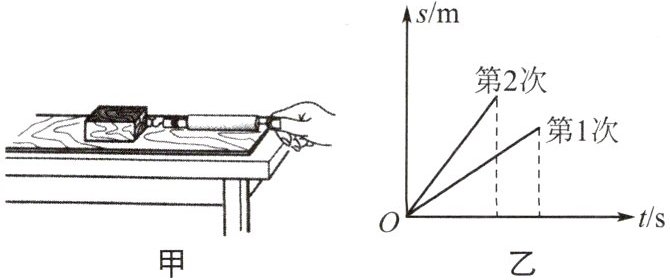 5. 如图甲所示,木块放在水平面上,用弹簧测力计沿水平方向拉动木块使其做匀速直线运动,在同一水平面上两次拉动木块得到的$s - t$图像如图乙所示.第$1$、$2两次弹簧测力计示数分别为F_{1}$、$F_{2}$,速度分别为$v_{1}$、$v_{2}$.若运动时间相同,拉力所做的功分别为$W_{1}$、$W_{2}$,则下列判断正确的是