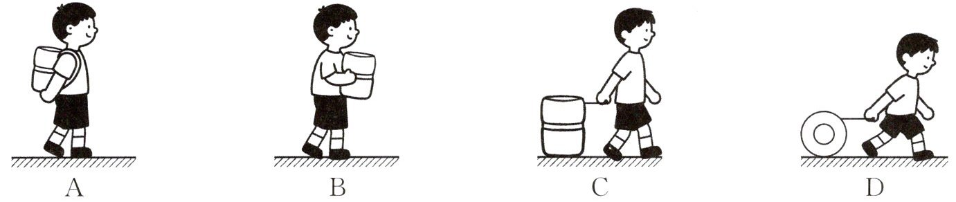 C 解析:选项A、B中小华是用背、抱的方式,即力的方向向上,桶是在水平方向上移动距离,因此他没有对水做功;滑动摩擦力大于滚动摩擦力,所以选项C中的拉力大于选项D中的拉力,由于移动的距离s相同,由$W=Fs$可知,C选项中做功最多.