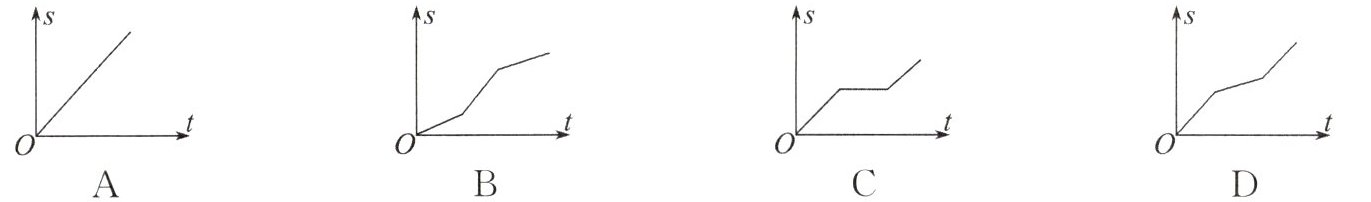 D 解析:汽车在平直公路上沿直线向前行驶时比在泥泞路面上行驶时受到的摩擦力小,由$P=\frac {W}{t}=\frac {Fs}{t}=Fv$可知,当P不变,F增大时,v减小,即途中经过泥泞路面时行驶速度减小.在s-t图像中,s与t成正比时汽车做匀速直线运动,经过泥泞路面时,速度变小,则s-t图像的斜率变小,D符合题意.