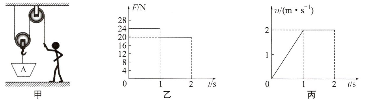 2. 如图甲所示,空吊篮$A重25N$,绳子能承受的最大拉力为$100N$.小壮将$A$提升到高处,施加的拉力$F$随时间变化的关系图像如图乙所示,$A$上升速度随时间变化的关系图像如图丙所示.忽略绳重和摩擦,下列说法不正确的是