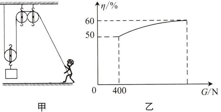 (2)由题图乙可知,当$\eta _{1}=50\% $时,建材重力$G_{1}=400N$,由于滑轮和钢绳间的摩擦力及绳重忽略不计,则根据$\eta _{1}=\frac {G_{1}}{G_{1}+G_{动}}×100\% $可得,动滑轮的重力$G_{动}=\frac {G_{1}-\eta _{1}G_{1}}{\eta _{1}}=G_{1}=400N$;当$\eta _{2}=60\% $时,由$\eta _{2}=\frac {G_{2}}{G_{2}+G_{动}}×100\% =\frac {G_{2}}{G_{2}+400N}×100\% =60\% $可得,此时建材重力$G_{2}=\frac {0.6×400N}{1-0.6}=600N$