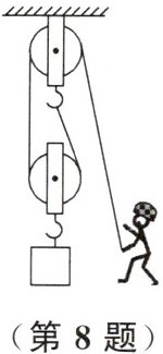 8. 用如图所示滑轮组匀速提升重为$200N$的物体,人对绳的拉力为$125N$,不计绳重和摩擦,滑轮组的机械效率为____.若人的体重为$550N$,拉动过程中绳始终未断裂,则用此滑轮组能提升的最大物重为____$N$.