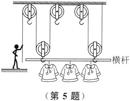 5. (2023·广安)学习了简单机械知识后,某同学自制了如图所示的晾衣架.他将重为$50N$的衣物挂在横杆上,拉绳使其匀速上升$1.6m$,用时$5s$(上升过程中,横杆保持水平),此过程中该装置的机械效率为$80\%$(不计绳重及摩擦).下列分析正确的是