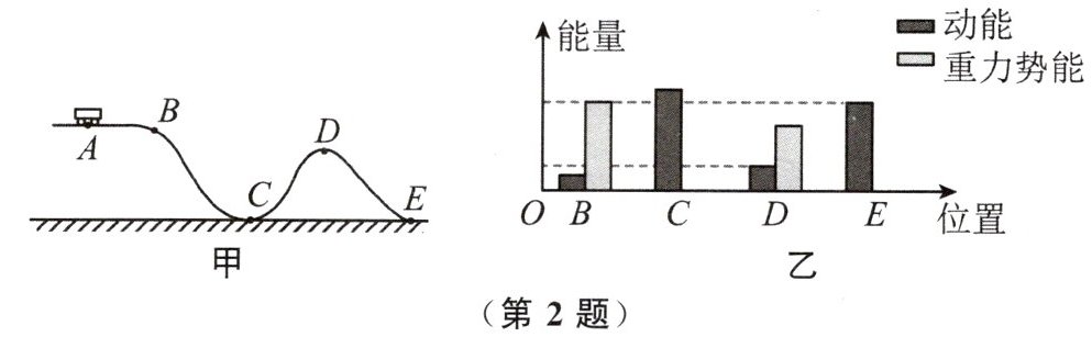 2. 图甲中过山车从A点出发,先后经过B、C、D、E点.图乙是过山车在B、C、D、E点的动能和重力势能大小的示意图,则过山车的动能在____点最大,B点重力势能的大小____(选填"大于""小于"或"等于")E点动能的大小.在这个过程中,过山车的机械能是____(选填"变化"或"不变")的.