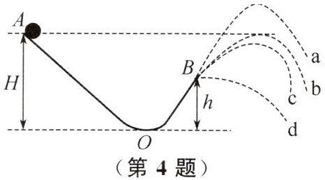 4. 如图所示,AOB是光滑轨道,A点的高度H大于B点的高度h,让小球从A点由静止开始自由滑到O点的过程中,____能转化____能;小球到达B点后离开轨道,则小球离开B点后最符合实际的运动轨迹是____.(不计空气阻力)