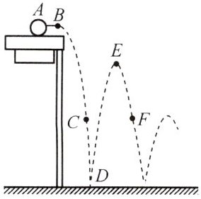 16. (2024·内蒙古)如图所示,从A点沿水平桌面滚落的小球的运动轨迹如虚线所示,C、F两点等高,D为小球与水平地面的接触点.不计空气阻力,下列说法正确的是()