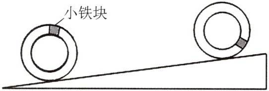 14. 科普活动中,老师为同学们展示了一个"自动爬坡"实验,惊艳了全场.该实验如下:将一个用轻质泡沫做成的圆环轻轻放在一个斜坡上,结果发现圆环不但没有滚下,反而加速滚上了斜坡.揭秘后才发现,这是一个内部镶嵌了小铁块的圆环,如图所示,在圆环(含小铁块)加速滚上斜坡的过程中,下列说法正确的是()