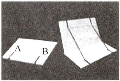 18. 某兴趣小组将一张硬卡片对折,在开口的一边剪两个小豁口A和B,然后套上橡皮筋,做成了一个会跳的卡片(如图所示).为了探究卡片跳起的高度与哪些因素有关,该兴趣小组提出了如下猜想:A.与卡片的质量有关;B.与橡皮筋的形变量有关;C.与橡皮筋的根数有关.为了验证猜想,兴趣小组选用几根相同的橡皮筋和几张相同材质的卡片进行实验.