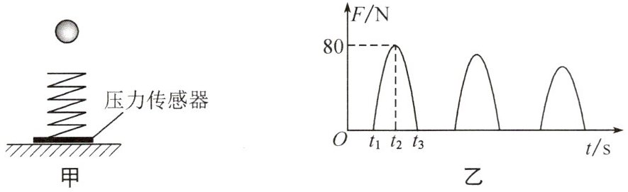 19. 如图甲所示,轻质弹簧竖直固定在水平面上.$ t = 0 $时,将一个重为G的金属小球从弹簧正上方某一高度处由静止释放,小球落到弹簧上压缩弹簧至最低点,然后被弹簧弹起,上升到一定高度后再下落,如此反复.通过安装在弹簧下端的压力传感器,测出这一过程中弹簧弹力F随时间t变化的关系图像,如图乙所示,则()
