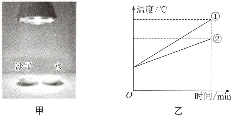 3. 如图甲所示为“观察不同物质吸热升温现象”的装置。将初温相同、质量均为50g的沙子和水分别放在两个瓷盘中,用红外灯均匀照射两个瓷盘,4min后,再用温度计分别测出沙子和水的温度,此时沙子的温度为55.4℃,水的温度为30.7℃,它们的升温图像如图乙所示。下列有关该实验的说法正确的是 ()