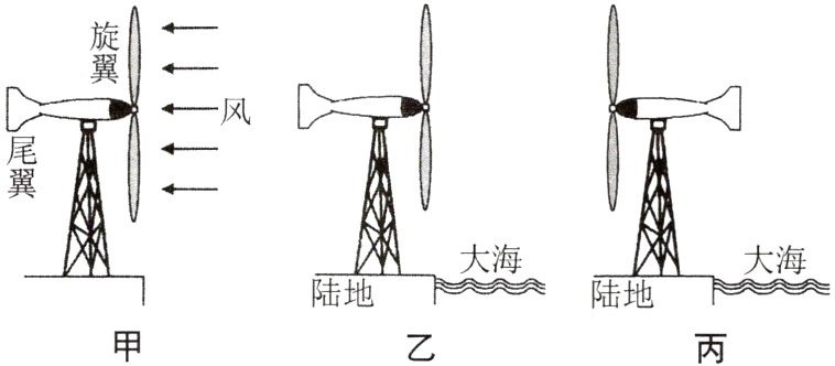 A 解析:题图乙中,发电机的旋翼朝向大海,说明此时风从大海吹向陆地,由于海水的比热容较大,白天时陆地比大海升温快,地面的热空气上升,风从大海吹向陆地,故题图乙所示的情景通常发生在白天;题图丙中,发电机的旋翼朝向陆地,说明此时风从陆地吹向大海,由于海水的比热容较大,夜晚时陆地比大海降温快,海面的热空气上升,风从陆地吹向大海,故题图丙所示的情景通常发生在夜晚.A符合题意.