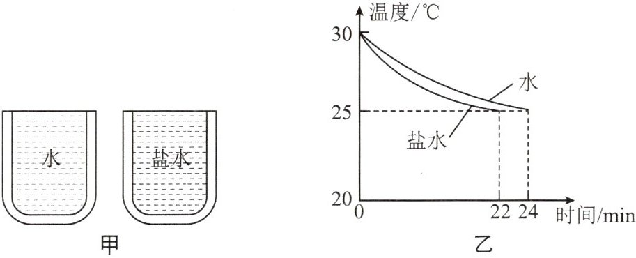 (4)如图甲所示,两个相同的保温杯分别装满水和盐水,水和盐水的温度都是$30^{\circ }C$,周围环境温度保持$20^{\circ }C$不变,保温杯敞开口,水和盐水的温度随时间变化的关系图像如图乙所示.已知水的比热容为$4.2×10^{3}J/(kg\cdot ^{\circ }C)$,水的密度为$1×10^{3}kg/m^{3}$,盐水的密度为$1.1×10^{3}kg/m^{3}$,则盐水的比热容为______$J/(kg\cdot ^{\circ }C)$.