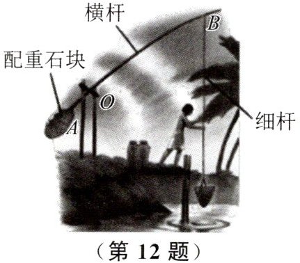 12. 如图所示是《天工开物》中记载的用来汲水的桔槔,它的前端系一个木桶,后端系一个适当的配重石块,支点为O点. 木桶装满水后,为了减小人向上提水时所用的力,下列操作可行的是()