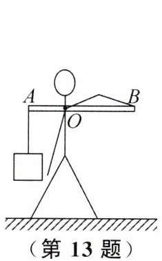 13. (2024·巴中)如图所示,小王站在水平地面上,将长为0.6 m、质量可忽略不计的木棒放在肩上,支点O到端点A的距离为0.2 m,在A点处挂一个重为40 N的物体,他用手竖直向下压住端点B处,使木棒保持水平平衡. 若小王的质量为50 kg,双脚与地面的总接触面积为$400 cm^2,g$取10 N/kg,则下列说法正确的是()