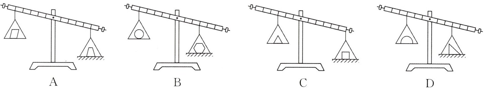 9. (2023·威海)如图所示,将若干重物放在4个自制天平的秤盘上,放入重物前天平都在水平位置平衡,放入重物后天平的右端都下沉,秤盘最终落在桌面上. 若不改变下图中秤盘的悬挂位置,仅将重物左右互换,互换后可能重新在水平位置平衡的天平是()
