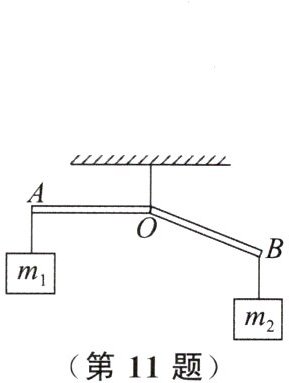 11. 如图所示,用细线将轻质杠杆AOB悬挂起来,分别在A、B两端挂上质量为$ m_1 $、$ m_2 $的重物时,杠杆平衡,此时AO恰好处于水平位置,$ AO = BO $,则$ m_1 $、$ m_2 $的大小关系为()