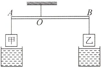 18. 由相同材料制成的甲、乙两个物体分别挂在杠杆A、B两端,O为支点($ OA < OB $),如图所示,杠杆在水平位置平衡. 若将甲、乙两个物体(不溶于水)浸没于水中,则杠杆()