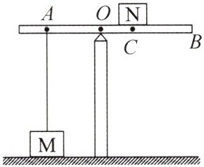 17. 如图所示,一根轻质杠杆水平放在支架上,$ OA = 20 $cm,M重60 N,N重20 N.
