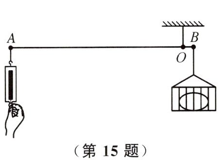 15. 小红和小华用一个弹簧测力计,一根长度为1 m、质量为1.2 kg、粗细均匀、质量分布均匀的圆柱形螺纹钢AB,一个金属筐制成了如图所示的机械装置. 制作时,她们将金属筐系于螺纹钢上的B端,将悬挂螺纹钢的钢索在螺纹钢上的悬吊点移至O点时,螺纹钢在水平位置平衡,测得$ OB = 4 $cm,则金属筐的质量为______kg. 称重时,将重物放入金属筐中,用弹簧测力计竖直向下拉螺纹钢的A端,使之再次在水平位置平衡,此时弹簧测力计的示数为15 N,则重物的质量是______kg. 在她们制作的装置中仅将弹簧测力计换成质量为1 kg的秤砣,制成杆秤,从O点开始,沿OA方向每隔1 cm标出对应的质量刻度,则该杆秤的分度值为______kg. (g取10 N/kg)