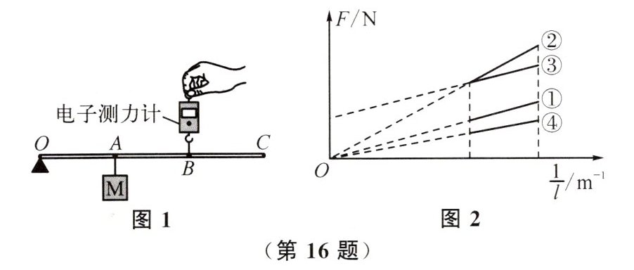 16. 如图1所示,轻质杠杆可绕O点转动,A点悬挂一个重为12 N的物体M,B点受到电子测力计竖直向上的拉力F,杠杆水平静止. 已知$ OA = AB = BC $,则F为______N. 保持杠杆水平静止,将F的作用点从B点移至C点,此过程中F的方向保持不变,F的力臂记为l,则F的大小变______,此时F与$ \frac{1}{l} $的关系图线为图2中的①;若将物体M的悬挂点从A点移至B点后,重复上述操作,则F与$ \frac{1}{l} $的关系图线为图2中的______(选填数字序号).