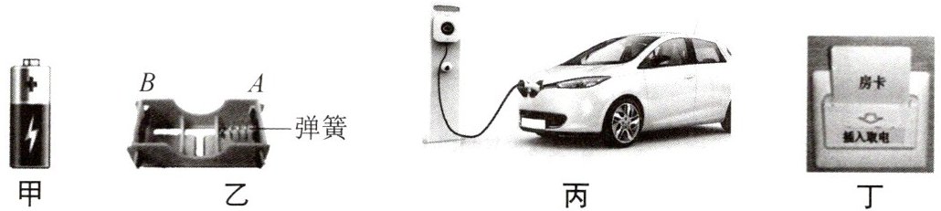 3. 将图甲中的一节干电池正确装入图乙的电池盒中,则电池的正极应接到电池盒的______(选填“A”或“B”)端;图丙是人们利用充电桩给电动汽车充电时的情景,此时电动汽车内的锂离子电池相当于电路中的______(选填“用电器”或“电源”);图丁为宾馆房间的取电房卡,将房卡插入槽中,房间内的用电器才能使用,房卡相当于电路中的______.