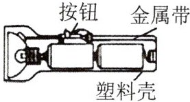 2. 如图所示是塑料外壳手电筒的电路,其中,干电池是电路中的______,金属带是电路中的______,塑料外壳上的按钮是电路中的______,小灯
