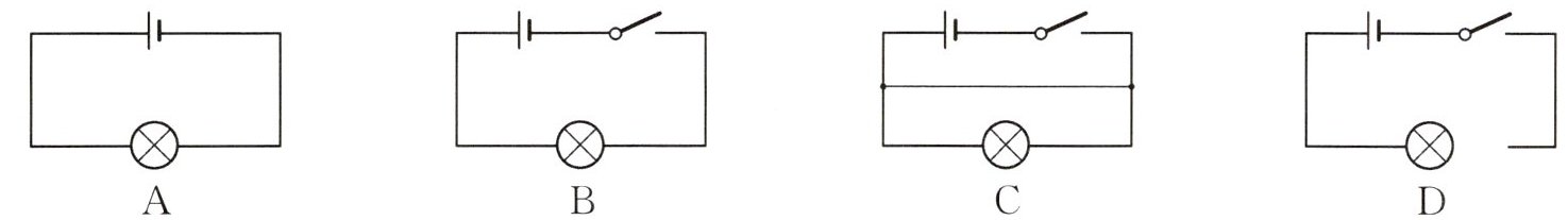 B 解析:选项A中电路缺少开关,是不完整的电路,A错误;选项B中有电源、开关、导线和用电器,是完整的电路,B正确;选项C中闭合开关时会形成短路,C错误;选项D中缺少部分导线,是不完整的电路,D错误.